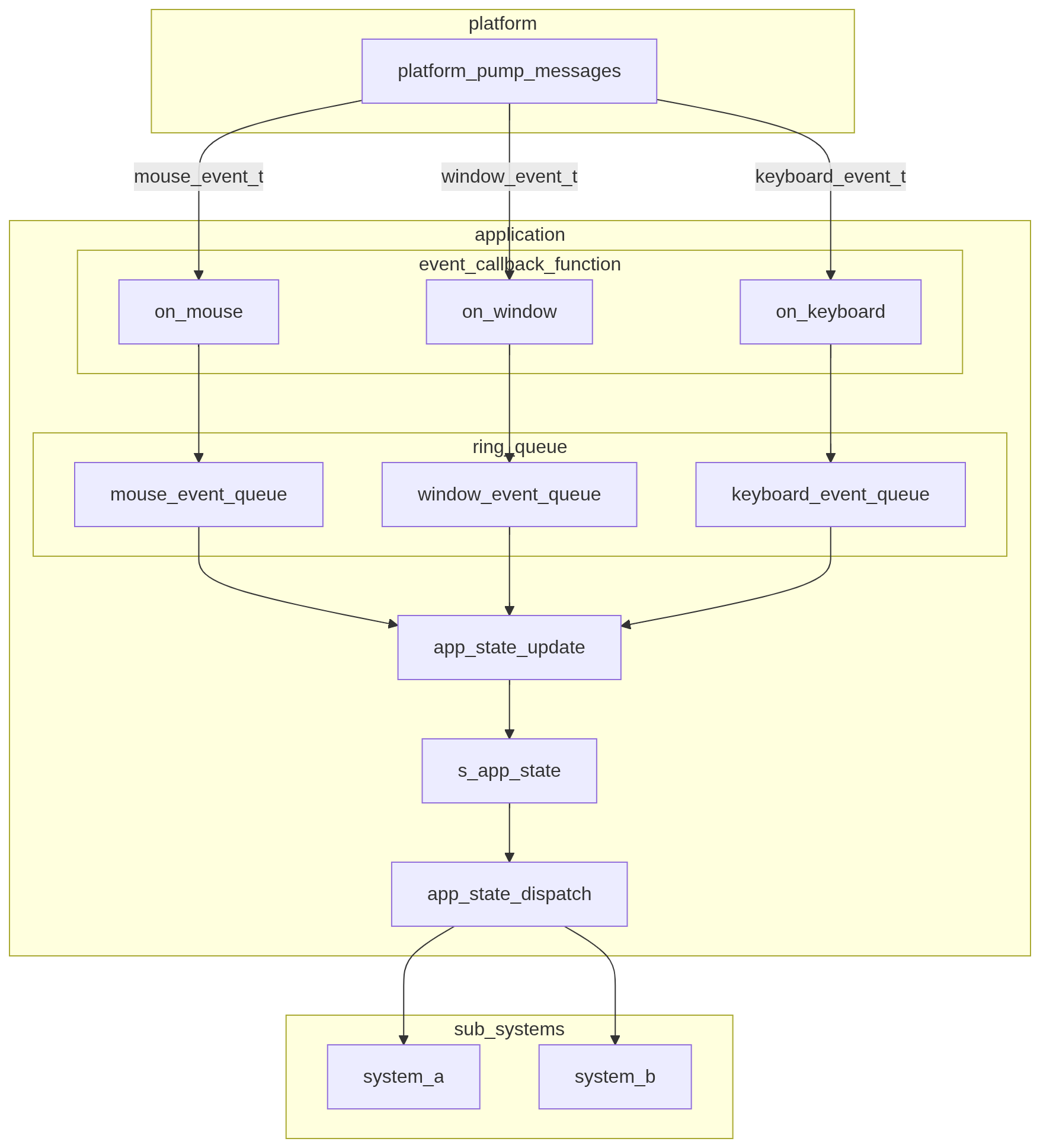 platform_pump_messages() により、キーボード、マウス、ウィンドウイベントを吸い上げる。platform_pump_messages()に引数でapplication.cから渡されたイベントコールバック関数によって、アプリケーションレイヤーが保持するリングキューにそれぞれ格納する。app_state_update()関数によってリングキュー内のイベントを処理し、s_app_state内で管理する状態変数を更新する。s_app_state内の状態変数の変化を各種サブシステムに通知する。s_app_state内の状態変数の変化をクリアする(変化なしにする、状態変数の値は保持)イベントコールバックは、リングキューへの格納のみにとどめ、イベントの処理は行わない。イベントの処理はapp_state_update()で一括処理する。 こうすることで、app_state_update()でイベントを状態に集約するため、同一フレーム内に同種イベントが複数回発生しても最終状態だけを採用できる(例:マウス移動)。